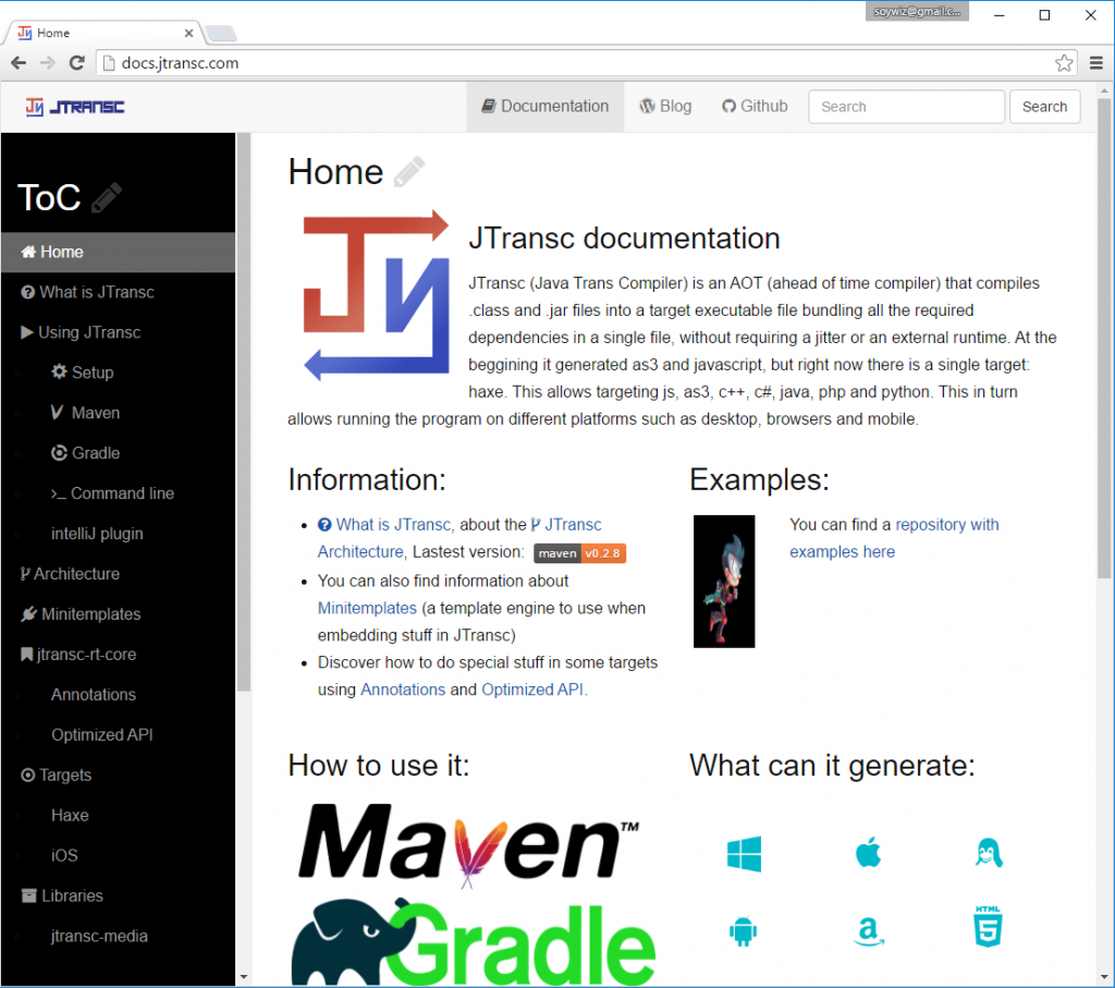 Today I’m pleased to announce a new documentation website for JTransc. It is a conversion of the previous wiki to Jekyll. You can access the documentation here: