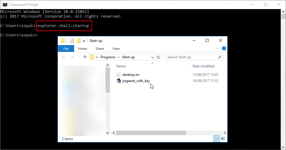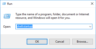 Older versions of Windows had an Startup folder easily accessible from windows start menu. But that’s not the case of Windows 10. That folder still exists though. And you can access it running “shell:startup” shell command, either from Task Manager -> File -> Run new task -> shell:startup, by right clicking windows icon and pressing Run, or by using explorer executable using a terminal and typing explorer shell:startup.